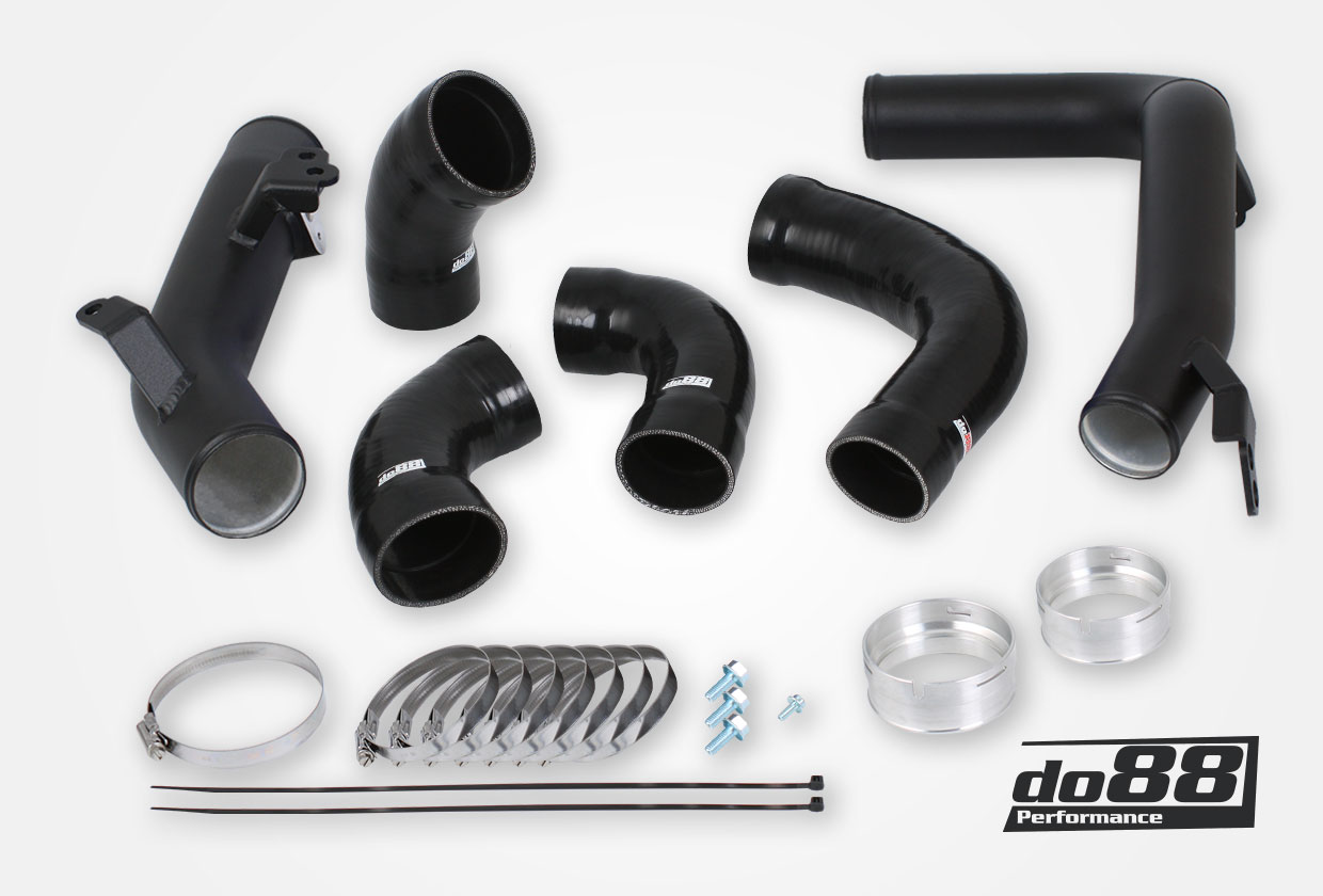 This kit is for you with significant horsepower goals that want to upgrade to the absolute best! Our pressure pipe has considerably better airflow than the stock pipe. This has been verified in several tests, both in car and in our own SuperFlow SF-1020 flow bench. Significant advantages with do88 pressure pipes (OEM pipes): Click here for installation guide! The pressure pipe is manufactured in 63mm (2,5”) mandrel bent seamless aluminium pipe. Custom made high quality silicone hose with 4 layers of polyester/aramid reinforcement. These hose can handle very high temperature and pressure! Always remember that the OEM intercooler pipes and hoses was designed for the power level the car was built for and a power increase or even very hard use of the car in a standard version may cause that the OEM pipes and hoses don’t have the performance you need. So only after engine software tune do88 pressure pipes will give a performance increase over the OEM pipes! do88 pressure pipes comes with all hardware necessary for installation. |