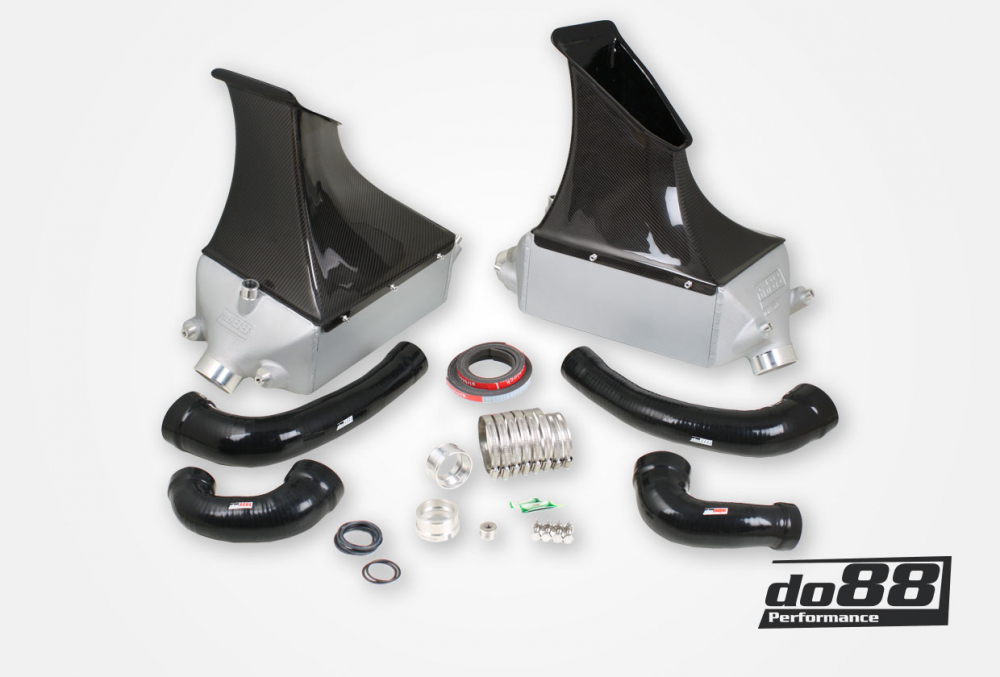 | Included parts in this kit: 1. Performance intercoolers 2. Carbon fiber air guides 3. Silicone hoses 4. Hose clamps 5. Rubber seals 6. Installation hardware |