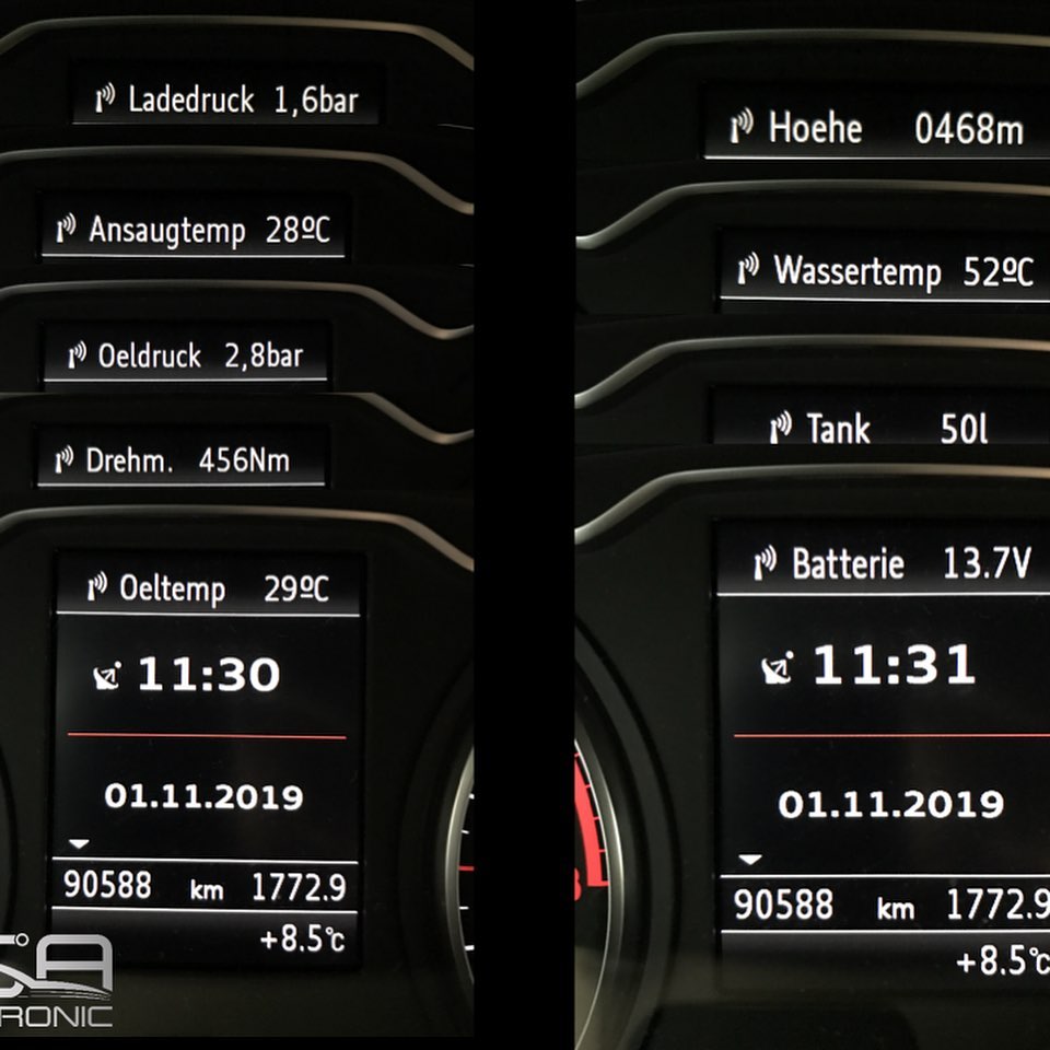 Ponadto mogą być wyświetlane różne wartości pomiarowe, takie jak aktualny poziom blokady, ciśnienie doładowania, moment obrotowy, woda, olej, temperatura przekładni i wlotu, …